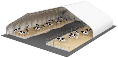 Прочный каркас и ПВХ-покрытие защищают стадо от ветра и осадков, а внутри легче поддерживать нормальный микроклимат – достаточно света, естественная вентиляция и удобная планировка под загоны, кормовые проходы и зоны обслуживания.